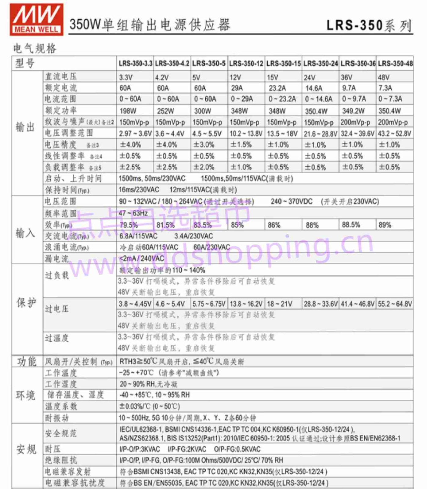 正品台湾明纬直流开关电源 LRS-350系列