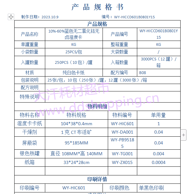 无二氯化钴无卤湿度卡 6点/蓝变粉/版面编号601